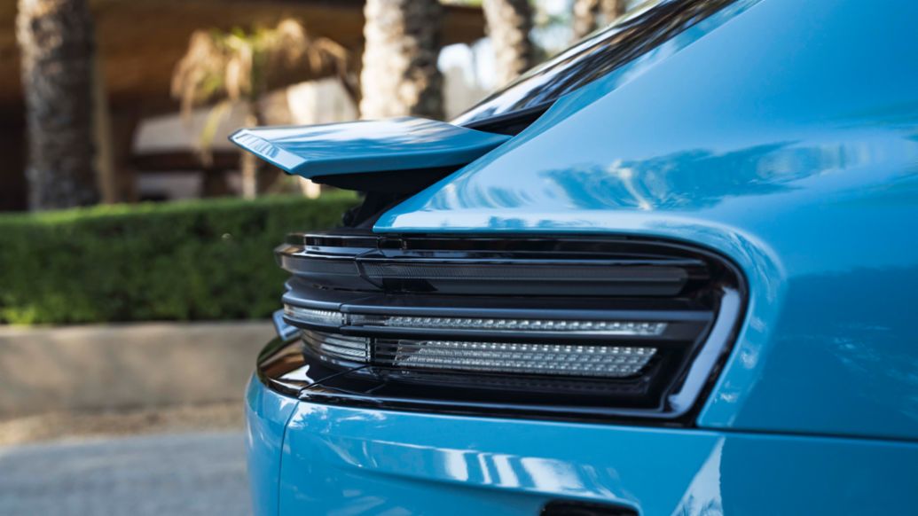It features Porsche’s signature four-point daytime headlights, which are complemented by the distinctive split-headlight design. Additionally, the car boasts a full-width strip tail light, giving it a sleek and modern look.