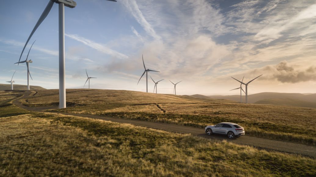 Zur Abdeckung des voraussichtlichen Strombedarfs der Macan Flotte – basierend auf 200.000 km Fahrleistung bei WLTP-Verbrauch – unterstützt Porsche den Ausbau von Wind- und Solaranlagen.