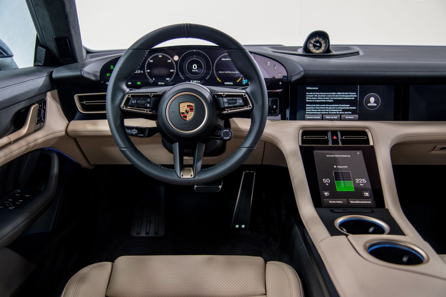 The cockpit signals the start of a new era of interior design at Porsche with its clear structure and a completely new architecture. The free-standing, curved instrument cluster forms the highest point on the dashboard. This places a clear focus on the driver axis. A central, 10.9-inch infotainment display and an optional passenger display are combined to form an integrated glass band in a black-panel look. All user interfaces have been designed from scratch for the Taycan. The number of classic hardware controls such as switches and buttons has been greatly reduced. Instead, control is intelligent and intuitive – using touch operation or the voice control function, which responds to the command “Hey Porsche”.